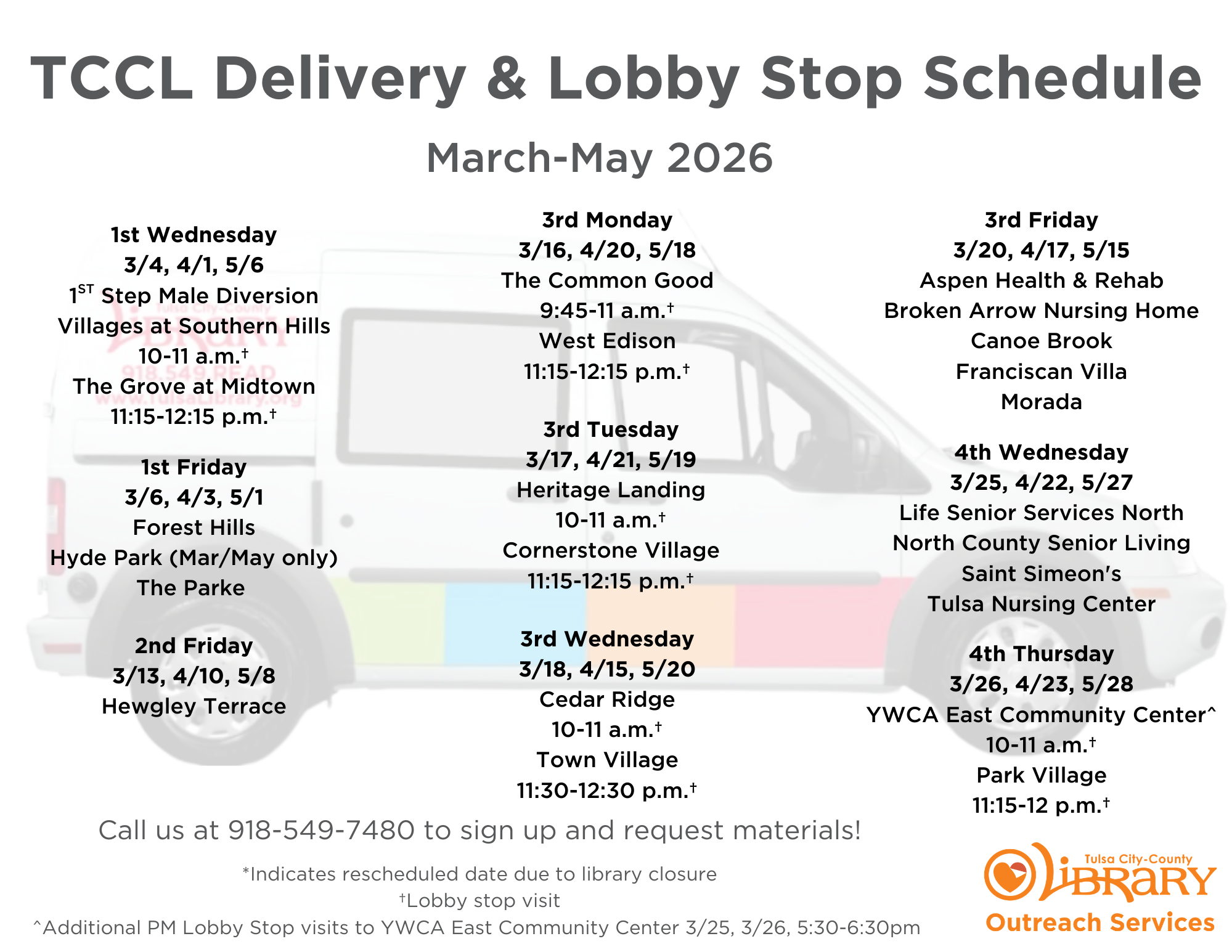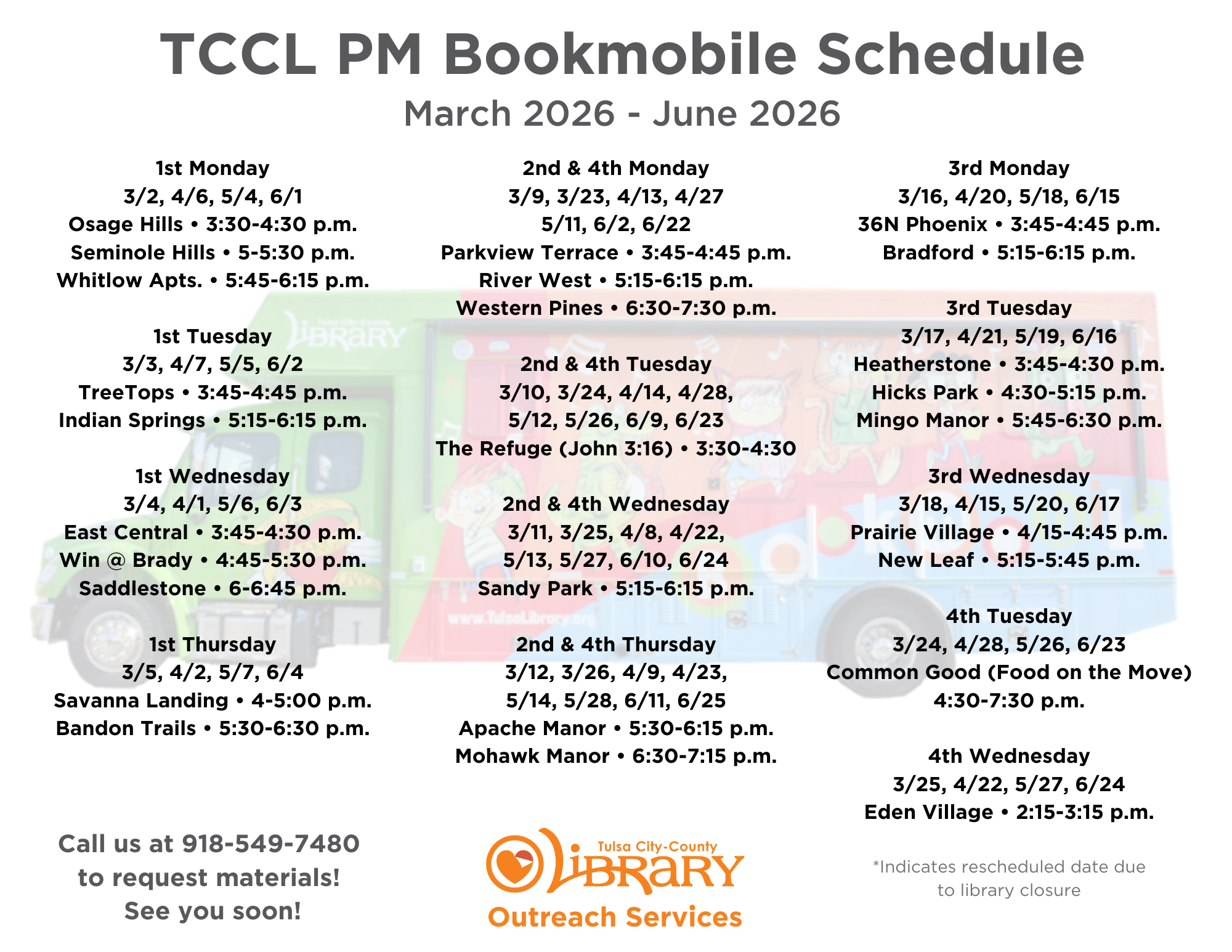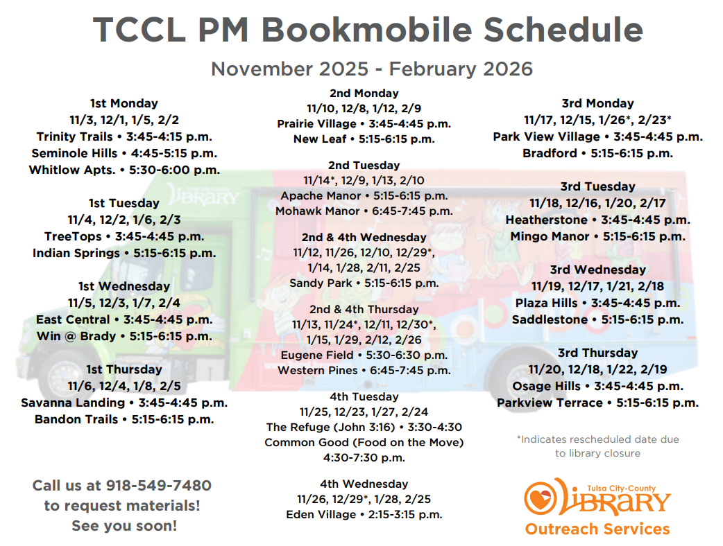 For schedule questions, please contact Outreach Services at 918.549.7480 or  outreach.services@tulsalibrary.org.