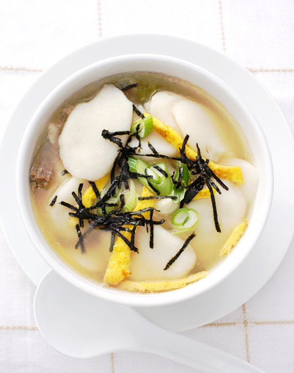 Tteokguk: This mild, filling soup consists of a broth (guk) with thinly-sliced rice cakes (tteok), almost like rice pasta. While it can be eaten year-round, tteokguk is traditionally eaten on for Korean New Year because it is believed to bring the diner good luck in the coming year. Tteokguk is typically garnished with cooked eggs, marinated meat, and gim, an edible seaweed common in Korean cuisine.
