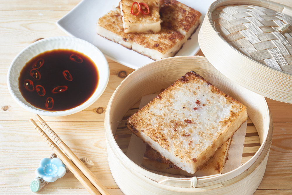 Lo bak go is a Chinese New Year’s dish that symbolizes good fortune for the year ahead. A unique combination of grated turnip, rice flour, and Chinese bacon, lo bak go is steamed into a moist pudding and is garnished with toasted sesame oil and scallions. Oyster and sweet chili sauces are commonly used for dipping, but any sauce is a good accompaniment.