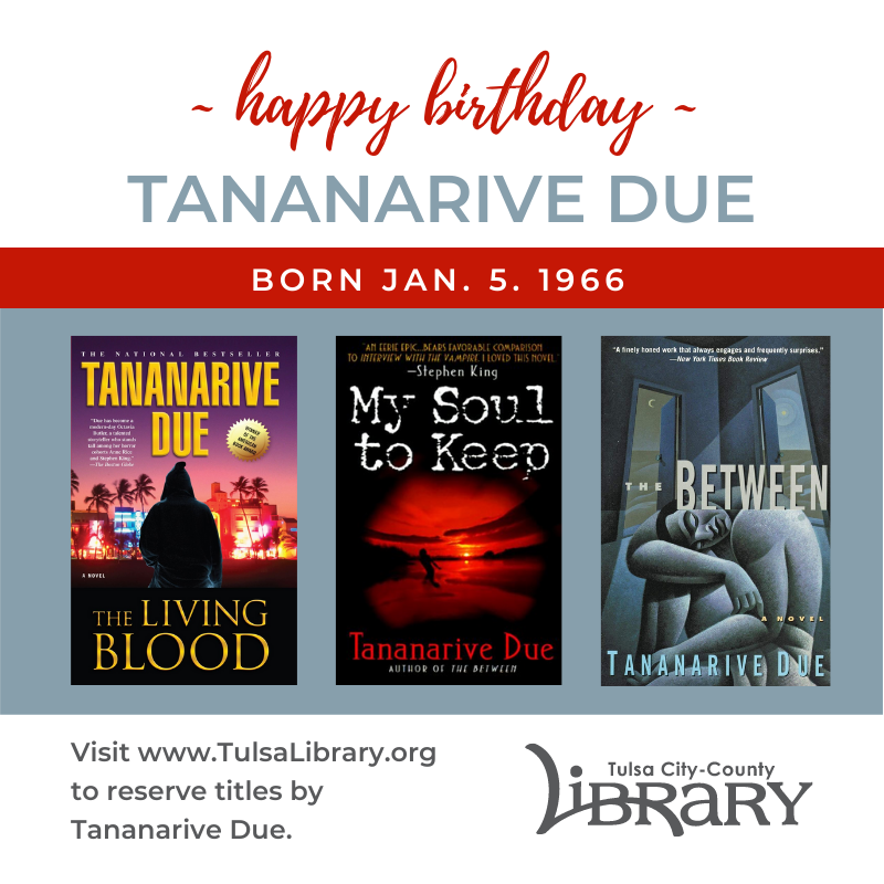 Tananarive Due (born Jan. 5, 1966): "Journalist and novelist Tananarive Due set her sights on a writing career at an early age. As a sixth grader watching the landmark television miniseries Roots, Due--the daughter of an attorney and a civil-rights activist--traced her own family's history, calling her work My Own Roots. As a young woman, Due attended a summer program for young writers at Northwestern University and won numerous awards for both writing and oratory." From Gale Literature: Contemporary Authors. Read the full piece here.